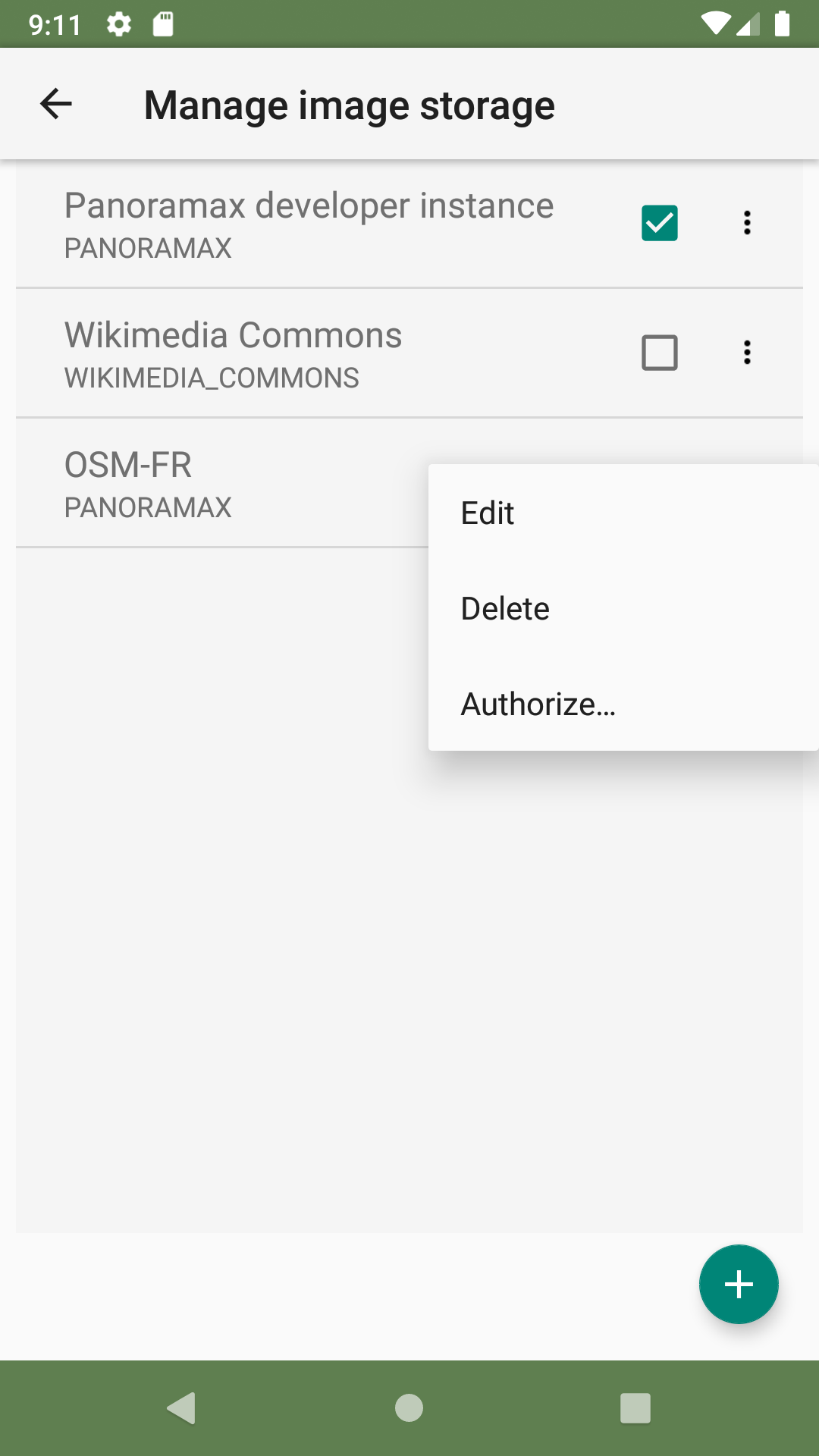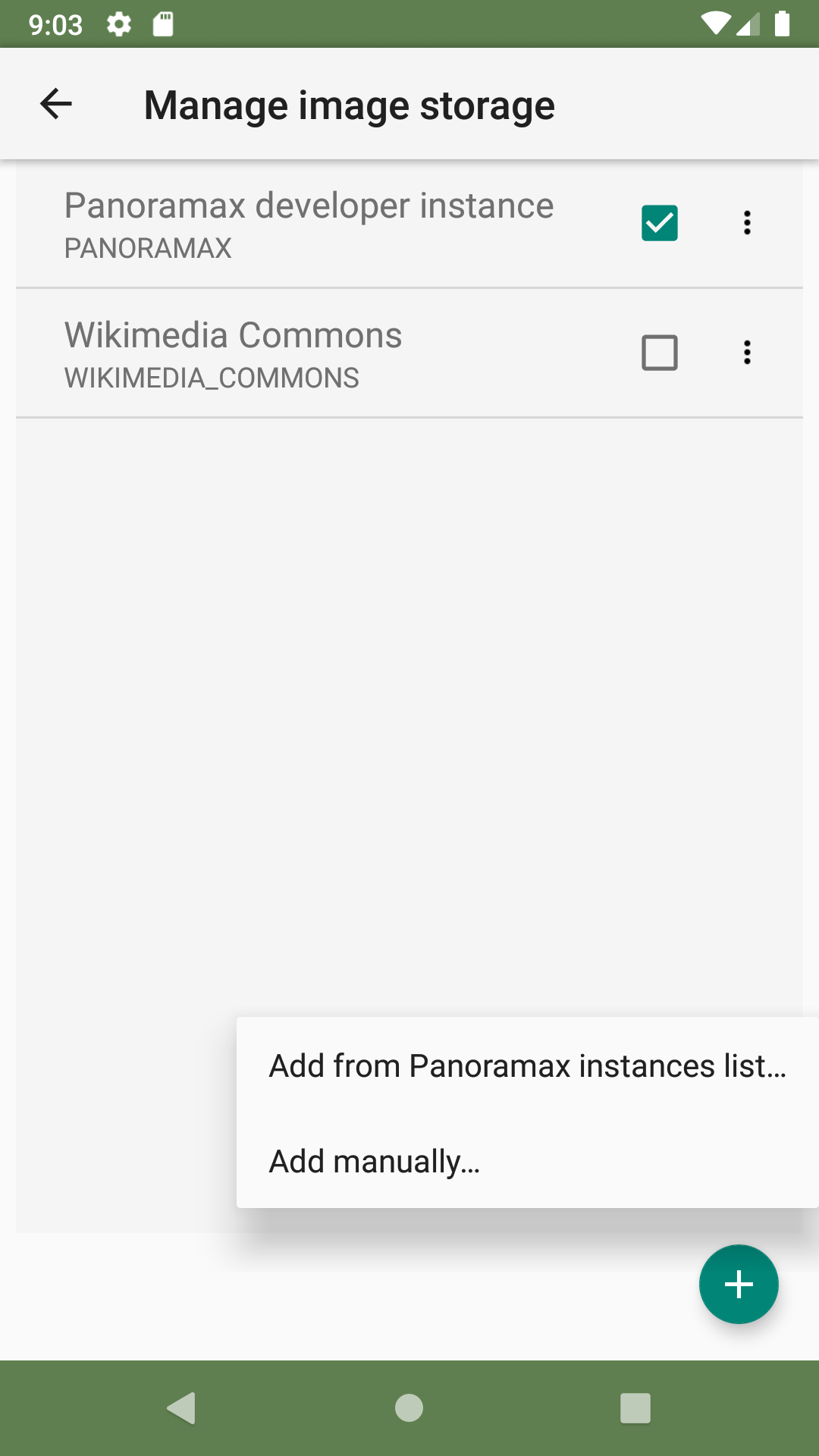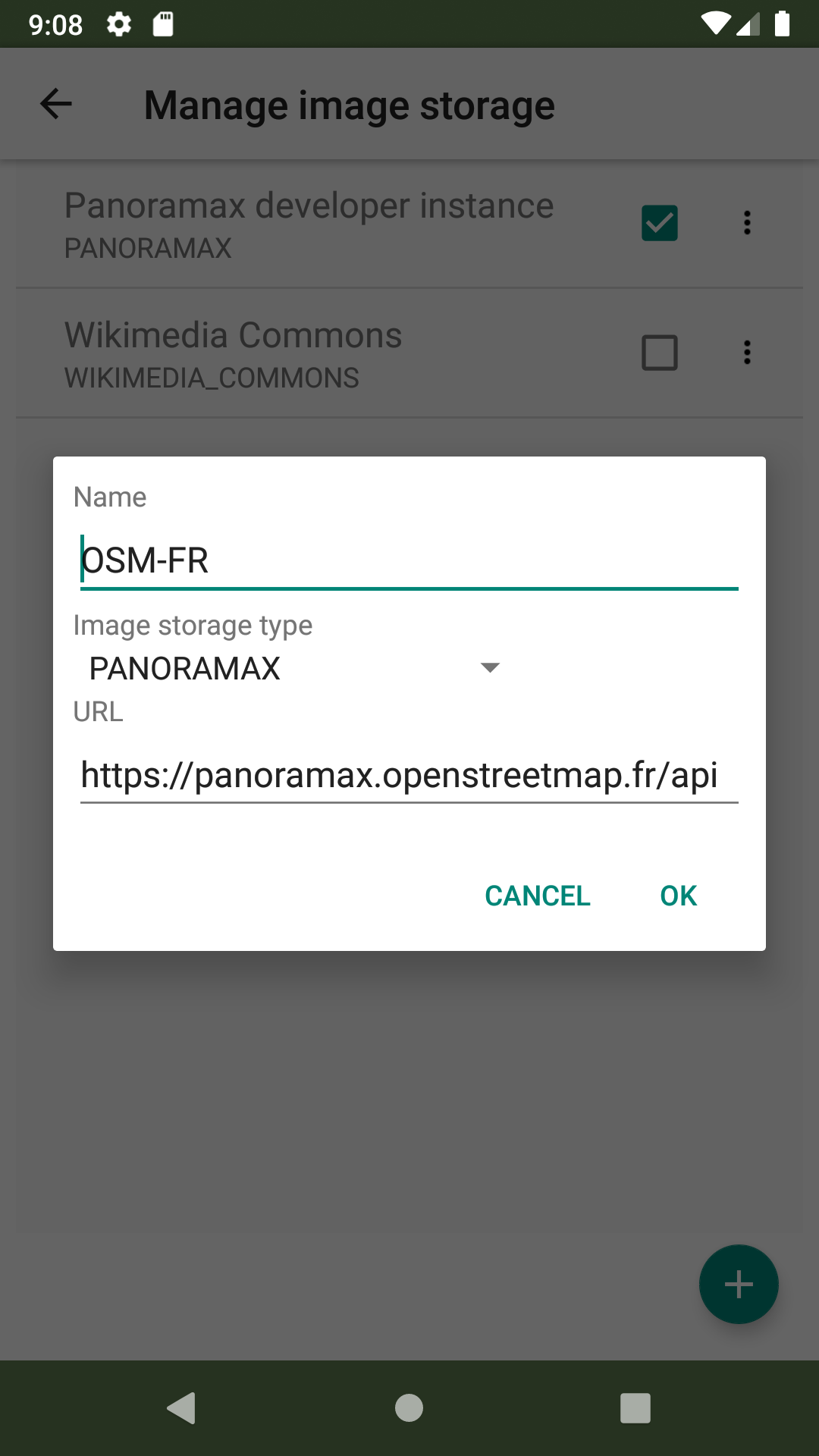 If you are using a public instance that has been registered with the Panoramax directory, you can simply click the + button and then select Add from Panoramax instances list and then save the configuration by pressing OK in the modal. If you are using a private instance you will need to manually create an entry with the API URL and a name.