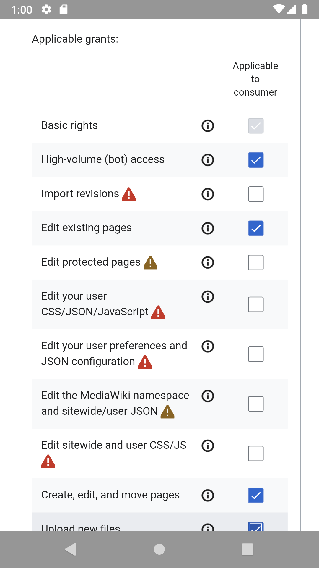Set the Application name to an unique value, note that Wikimedia doesn't support deleting unused key entries, so if you are redoing this you will need to use a different name each time.