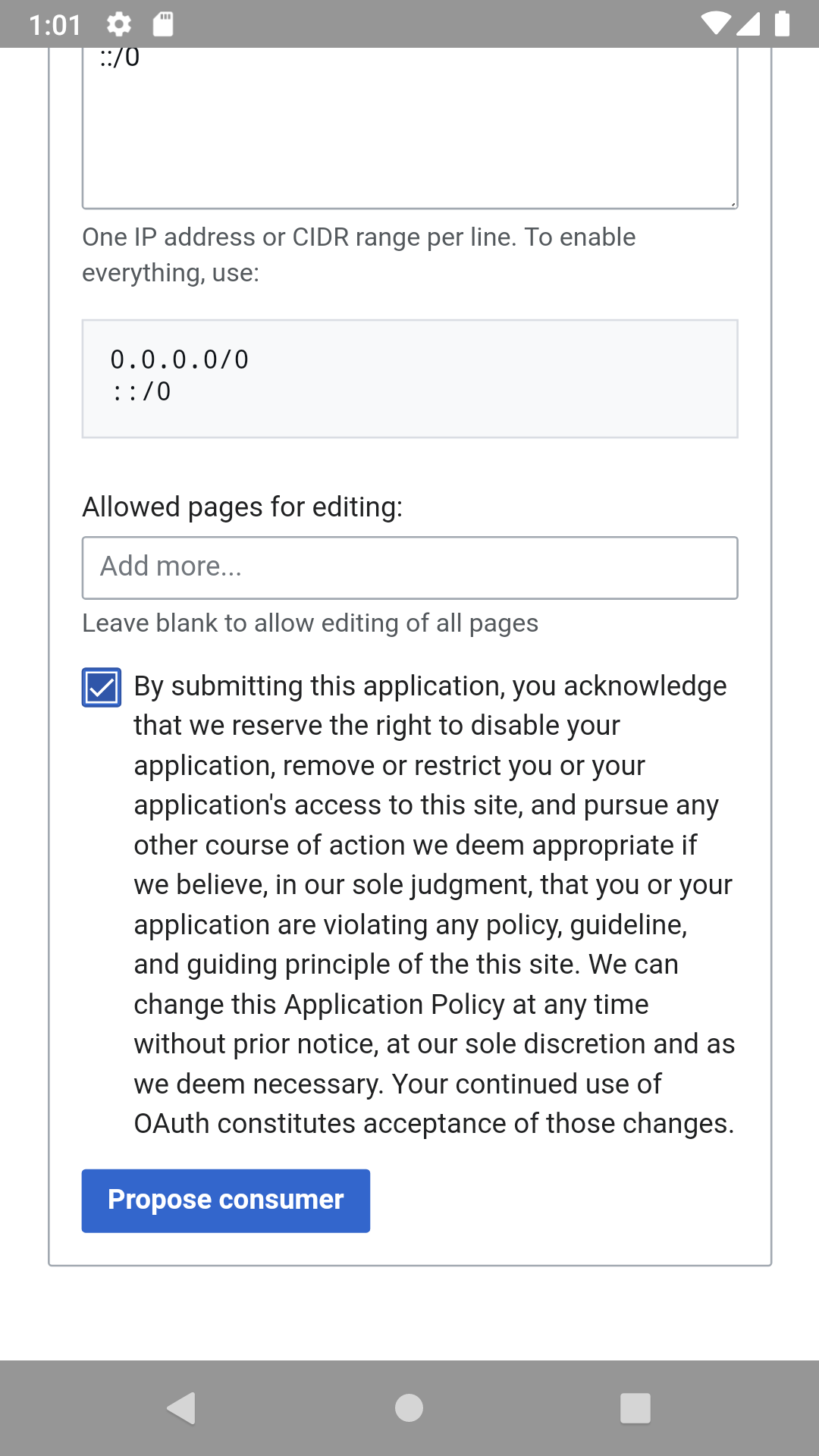 Scroll down to the final checkbox, except the terms and click Propose consumer.
